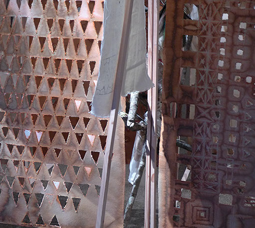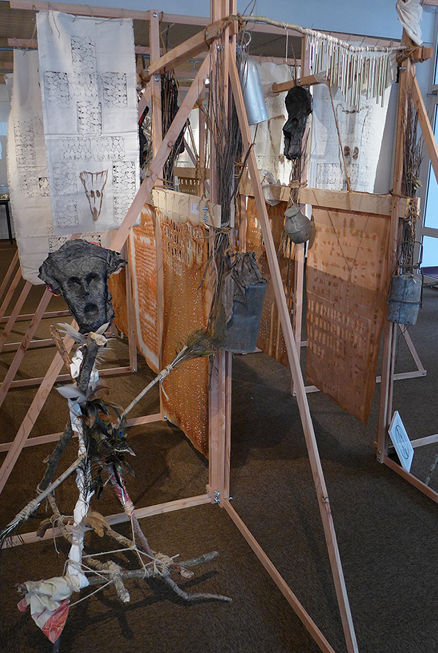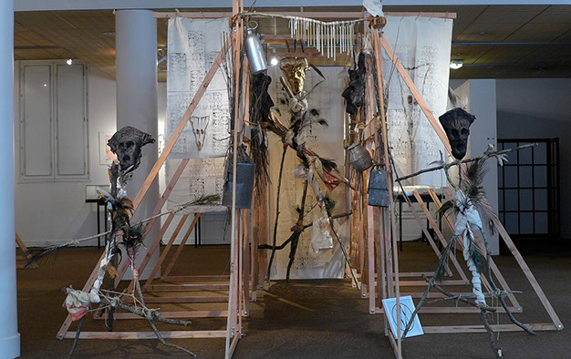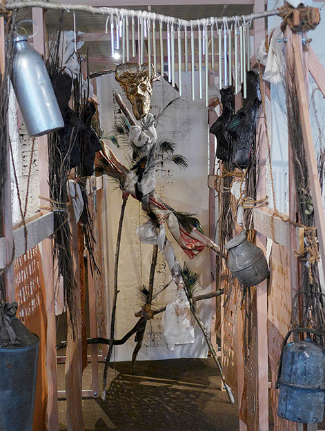 Structure en tasseaux, calicots, cordes, ficelles, bois, plumes, tissus, papier mâché, papier torchon...