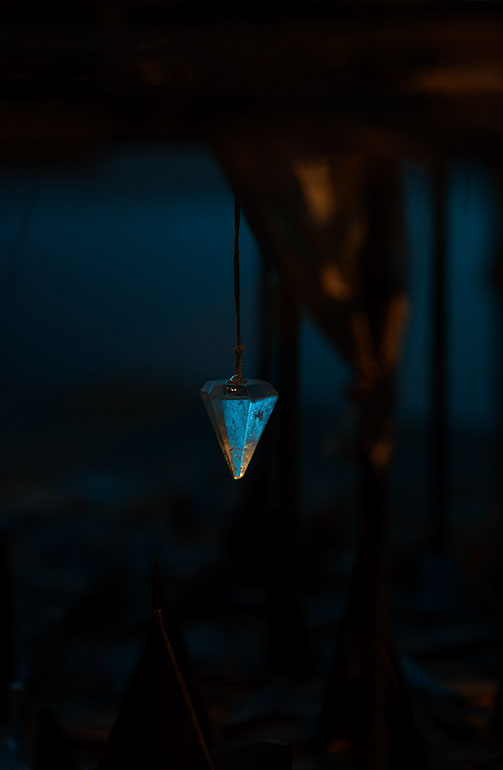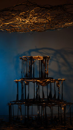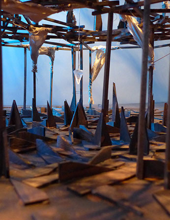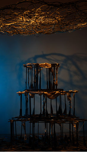 Sous une lumière tamisée par les cinq roues qui les surplombent, une construction sur pilotis à trois étages s’élève sur l’emplacement d’un labyrinthe qui se devine encore. La structure en lambeaux s’oppose au cristal de roche inébranlable, créant une atmosphère mystérieuse.