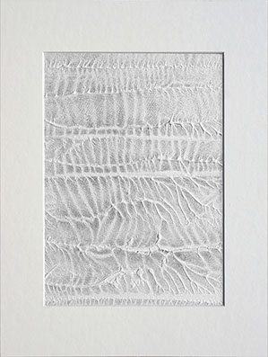 Cette technique à l'origine d'une série de dessins sur papier et sur toile est l'occasion de poursuivre mes recherches sur les limites de la visibilité qui se traduit ici sur plusieurs niveaux: le léger relief de la structure sous-jacente, les réserves blanches, le brouillage du sens.