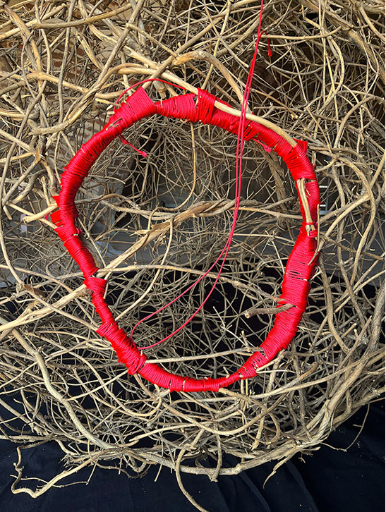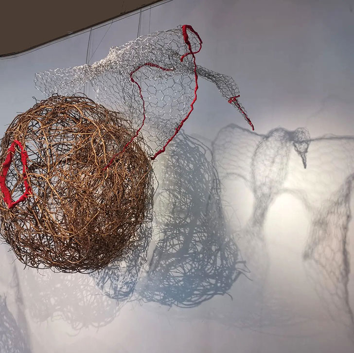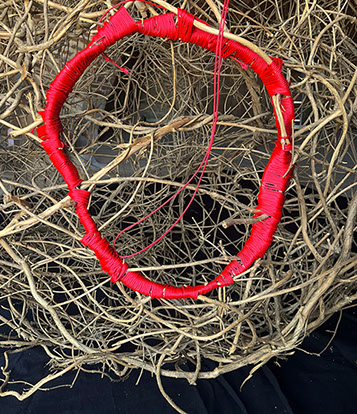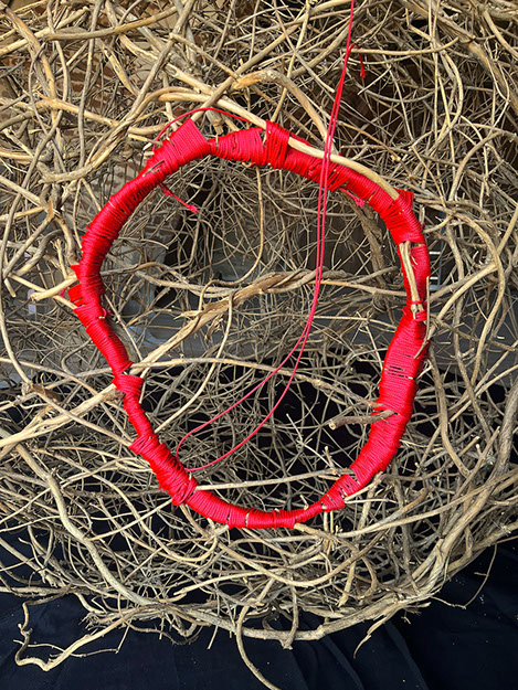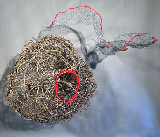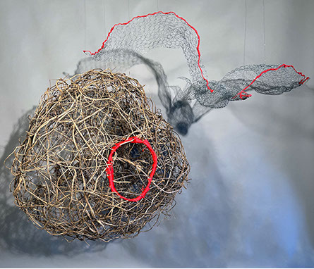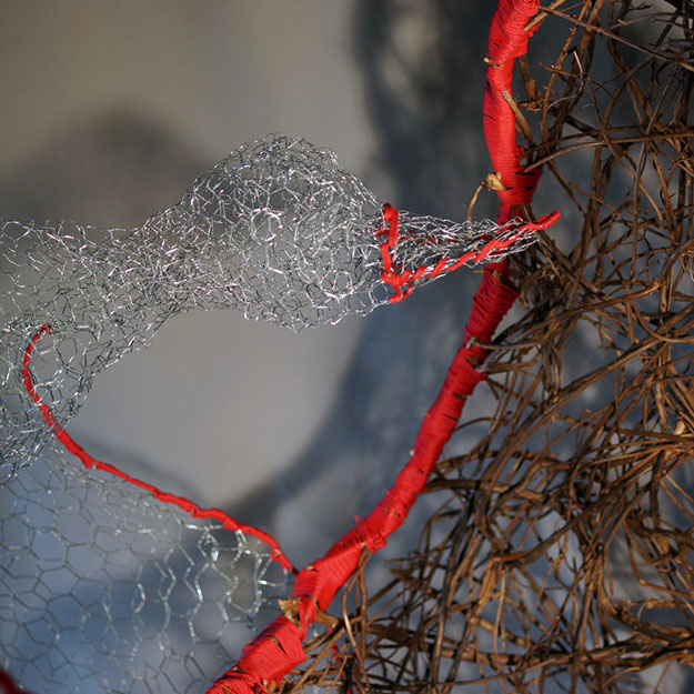 Grillage alvéolé maille hexagonale, lianes, ficelle rouge. 3 nids, 100 x 100 x 60cm maximum