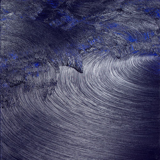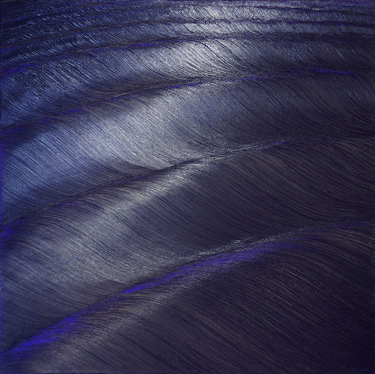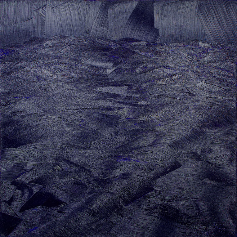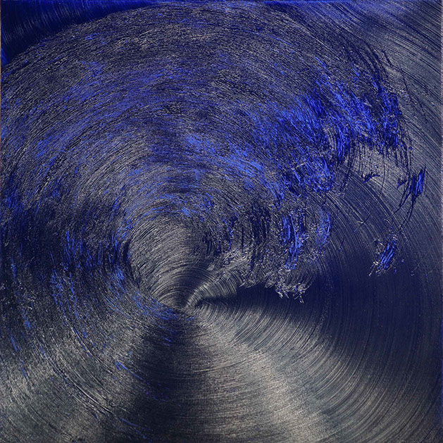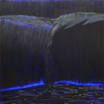 Le geste porté par l’énergie devient vague, il suit les ondes, surfe sur une crête ou un retour d’écume. Le pinceau creuse des sillons dans la pâte huileuse tandis qu’en surface, la lumière produit des miroitements infiniment changeants, renouvelant à chaque instant la vision du spectateur qui se déplace.