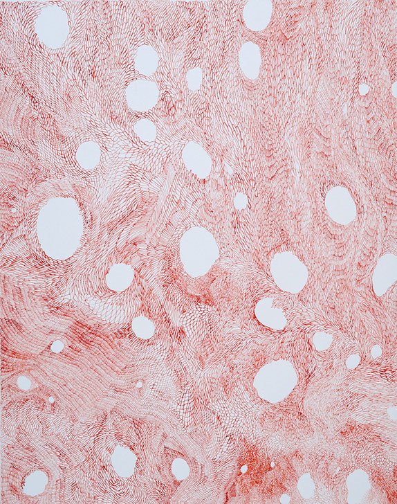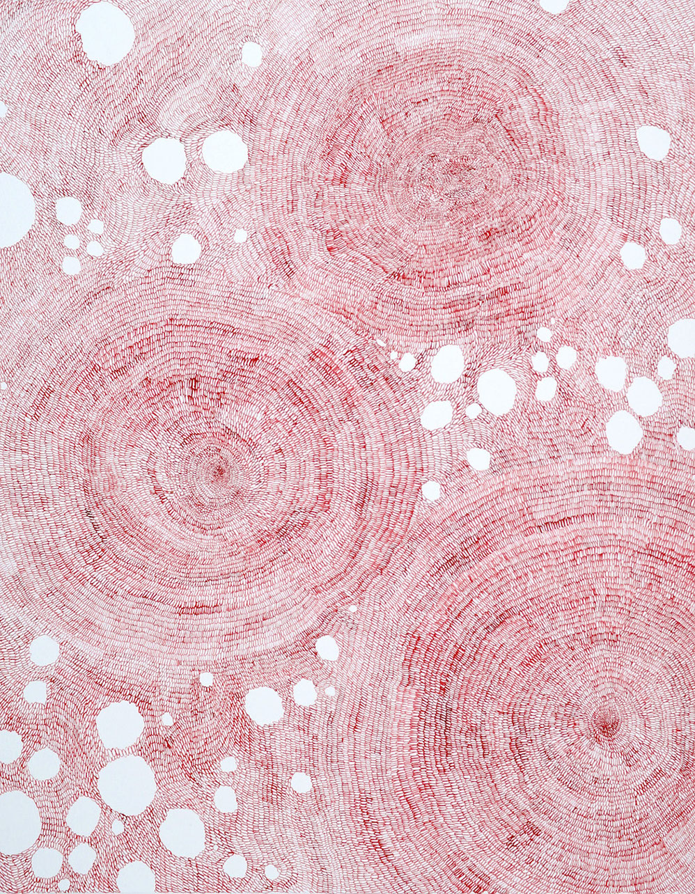 Tissages spatio-temporels est une série qui expérimente le rapport de l'espace au temps. Optiquement, puisque des trames différentes provoquent un effet mouvant de par le rythme changeant imprimé par le geste. Il s'agit aussi d'une expérience corporelle de mesure de cet espace-temps, du temps infini qu'il faut pour avancer, lentement, patiemment, et tisser la toile.