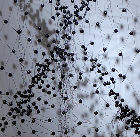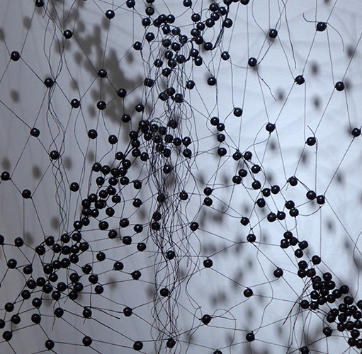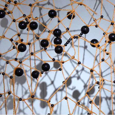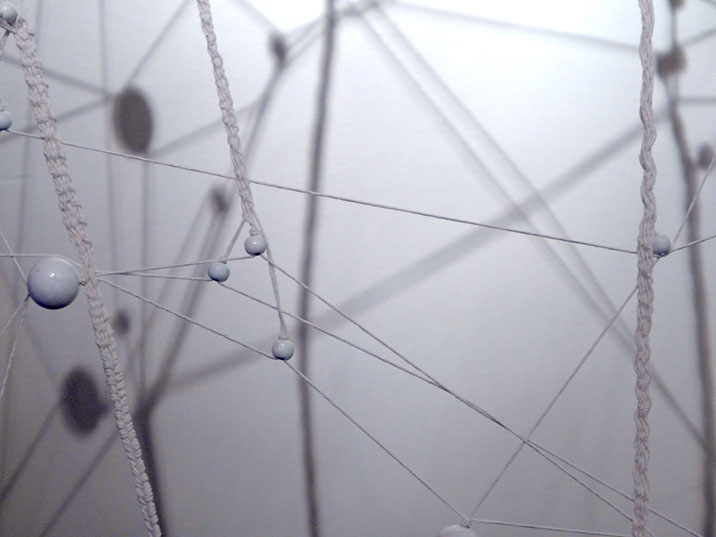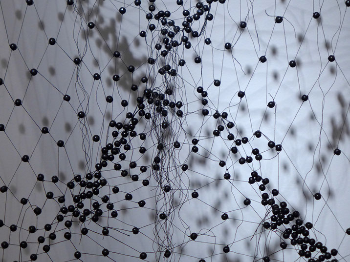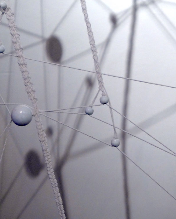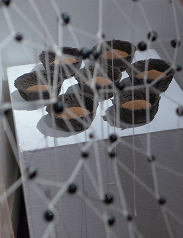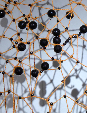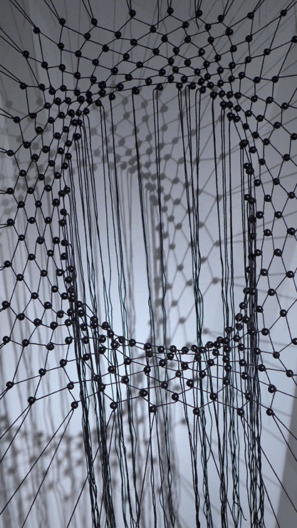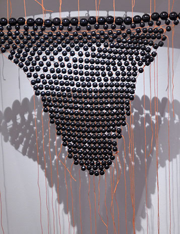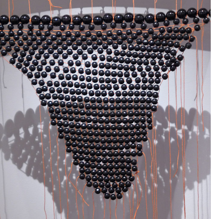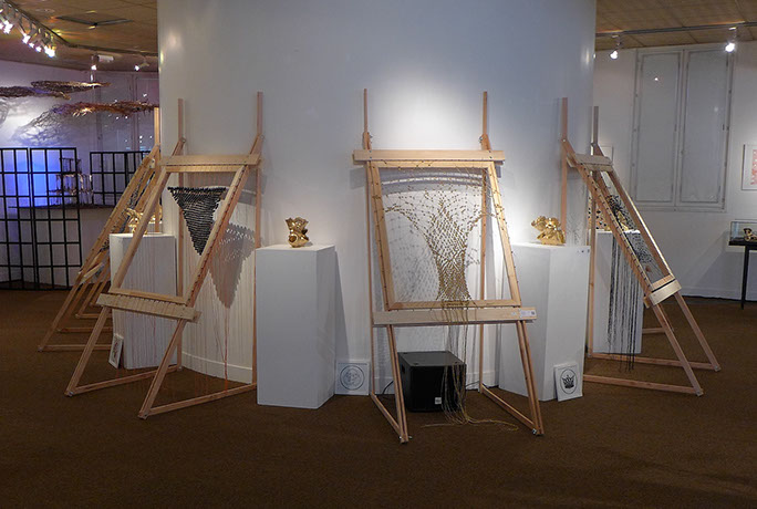 Le travail de la tisserande est représenté par sept métiers à tisser et sept tissages composés de fils et de perles de différentes matières et couleurs qui s’entremêlent comme autant de points et de lignes suggestives d’un univers féminin. À droite les sept coupelles remplies de terres rouges servant aux rituels de lavage des mains des tisserandes.