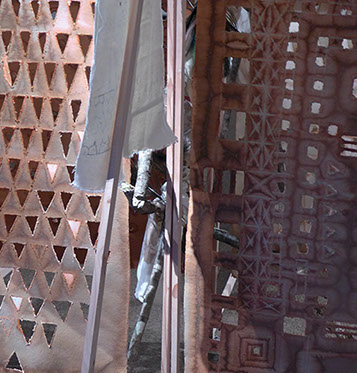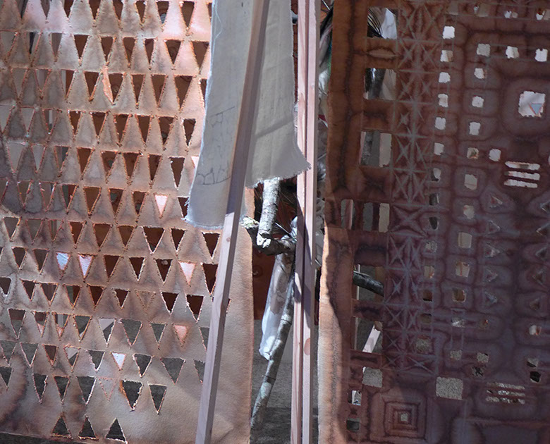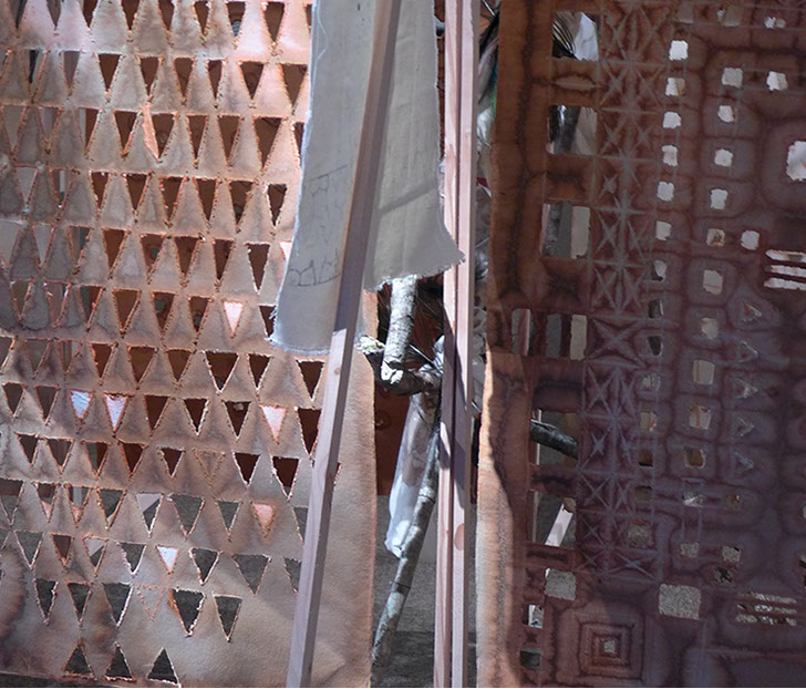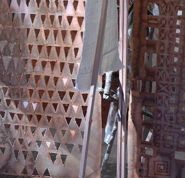 Structure en tasseaux, calicots, cordes, ficelles, bois, plumes, tissus, papier mâché, papier torchon...