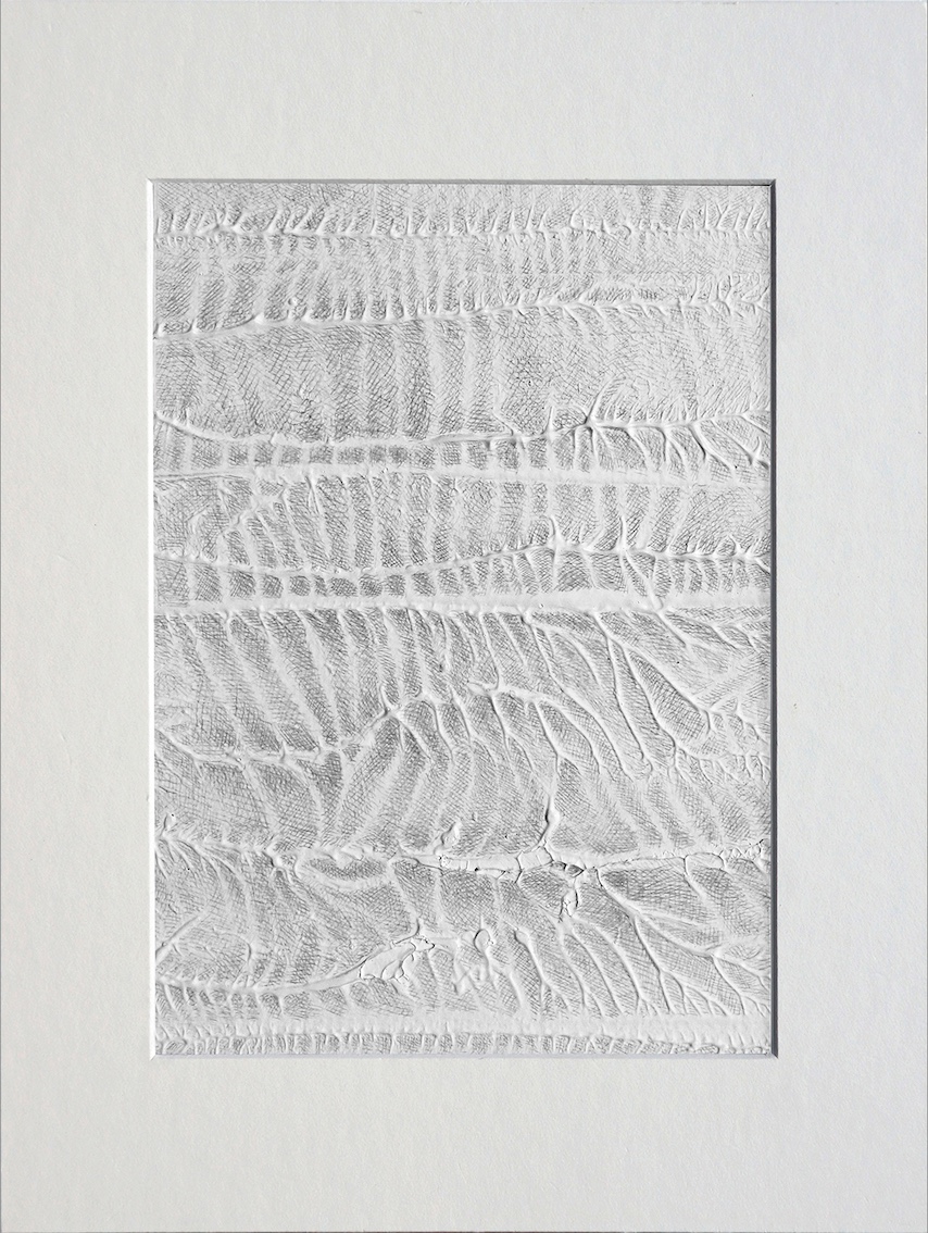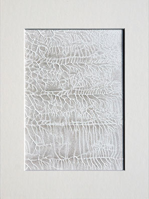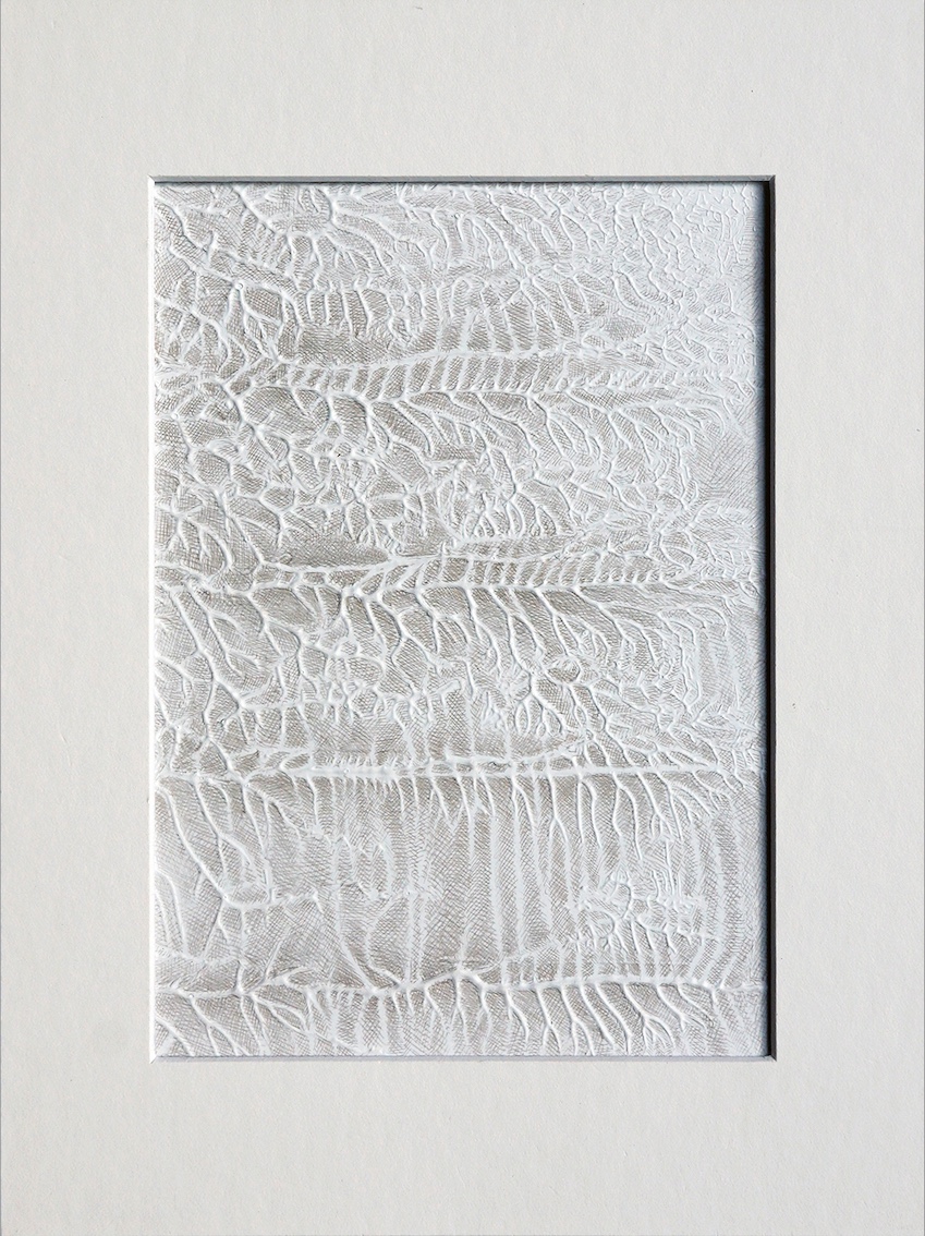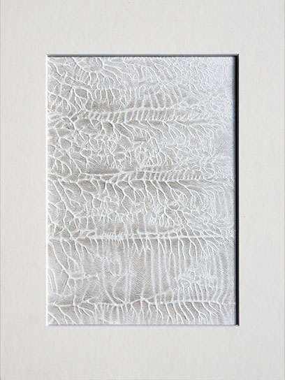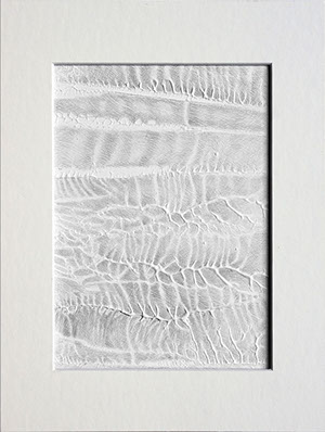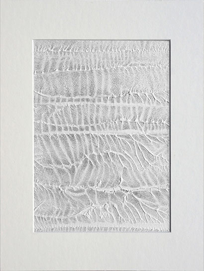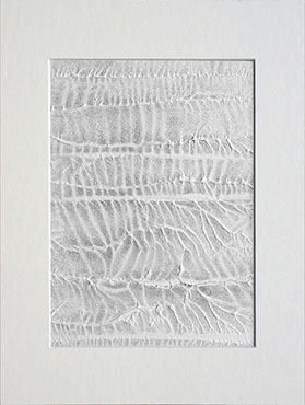 Cette technique à l'origine d'une série de dessins sur papier et sur toile est l'occasion de poursuivre mes recherches sur les limites de la visibilité qui se traduit ici sur plusieurs niveaux: le léger relief de la structure sous-jacente, les réserves blanches, le brouillage du sens.