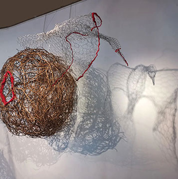 Grillage alvéolé maille hexagonale, lianes, ficelle rouge. 3 nids, 100 x 100 x 60cm maximum