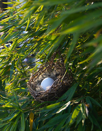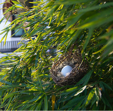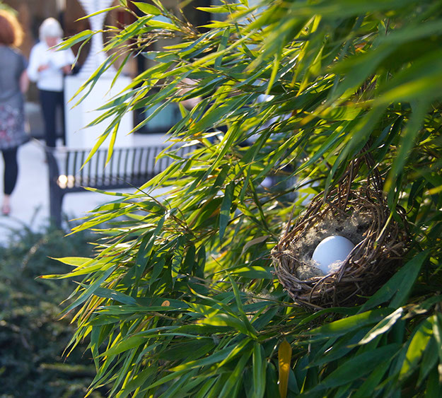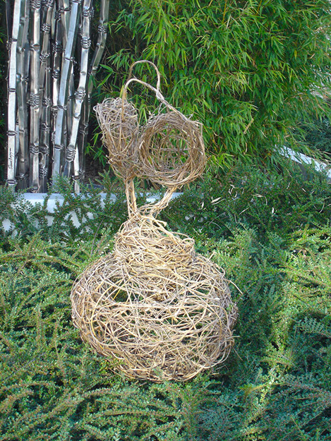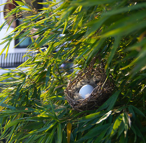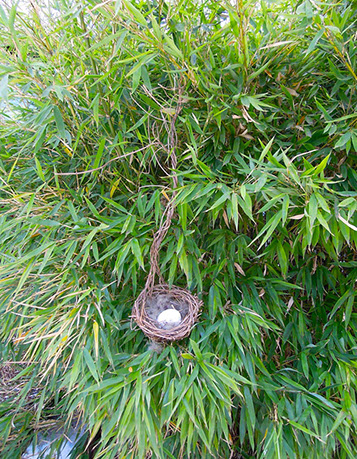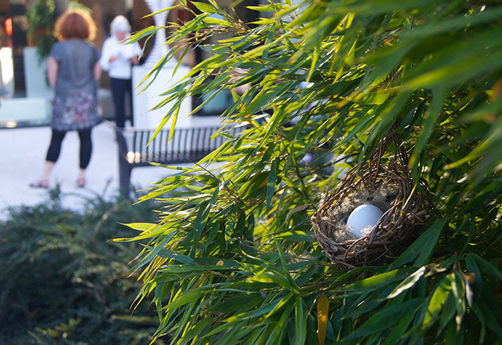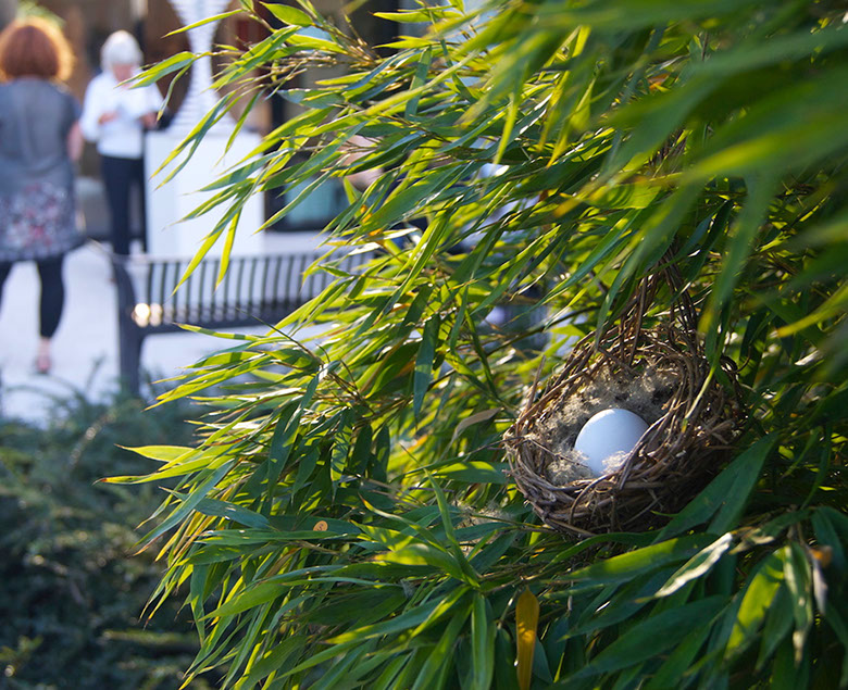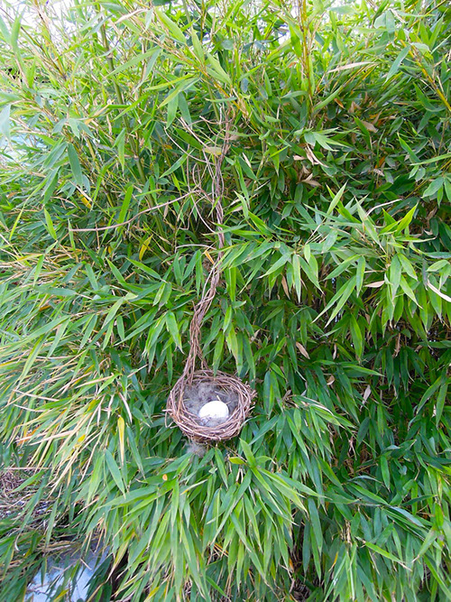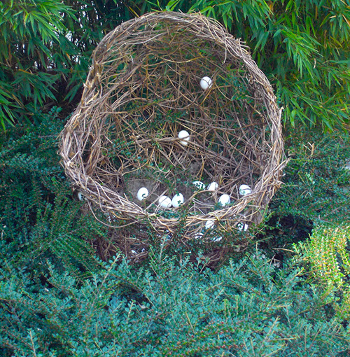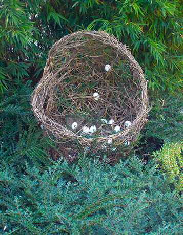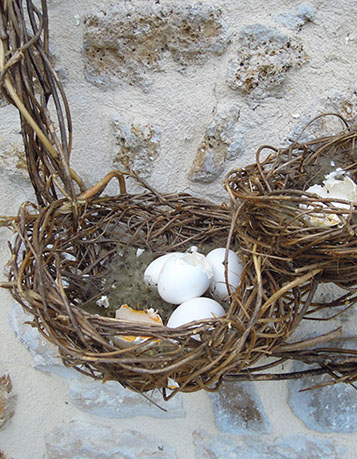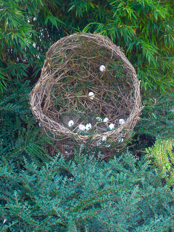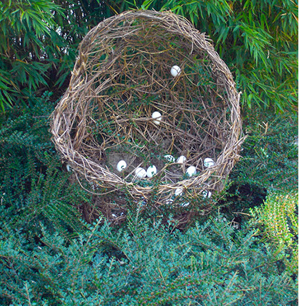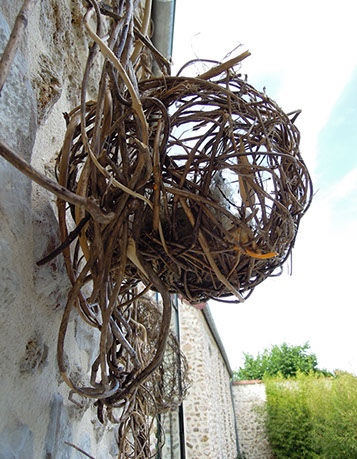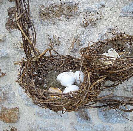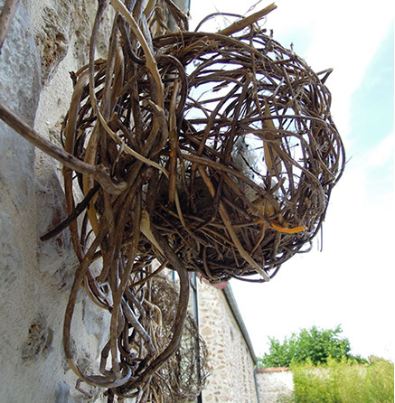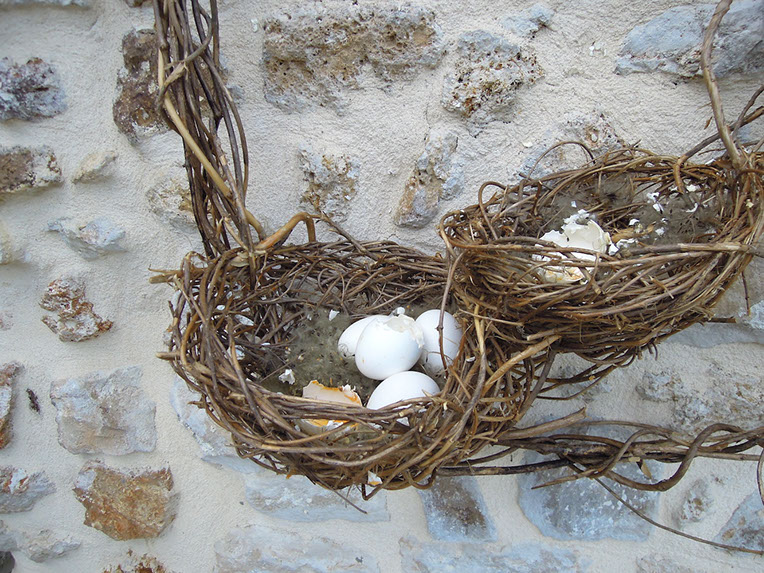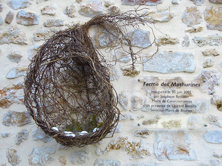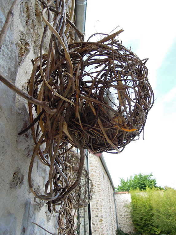 Installation d'un ensemble de nids exposés dans la cour intérieure d'une ancienne ferme transformée en centre d'art.