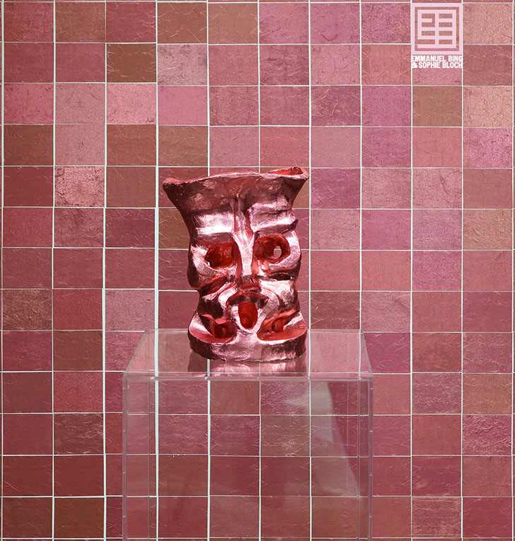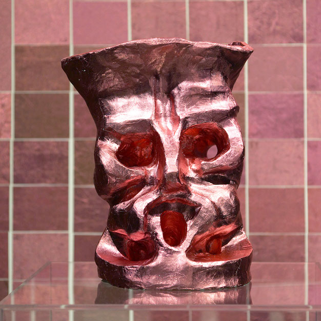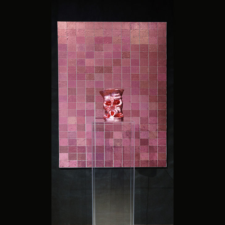 Les ouvertures dans la tête qui semble flotter comme en apesanteur dans l’espace laissent entrevoir les myriades de teintes que renvoient les papiers roses en arrière-plan.