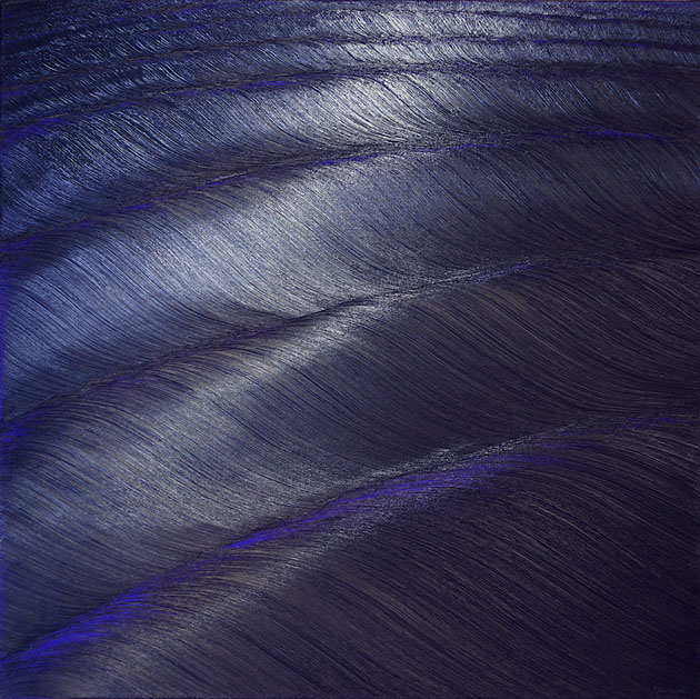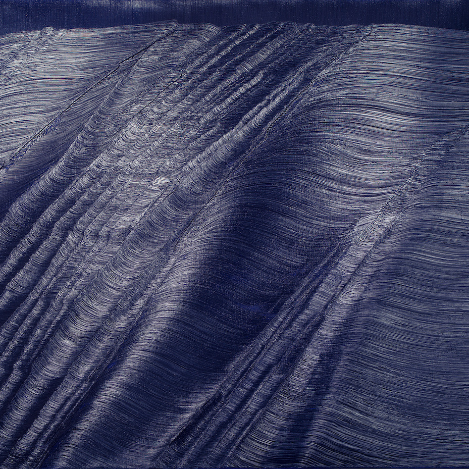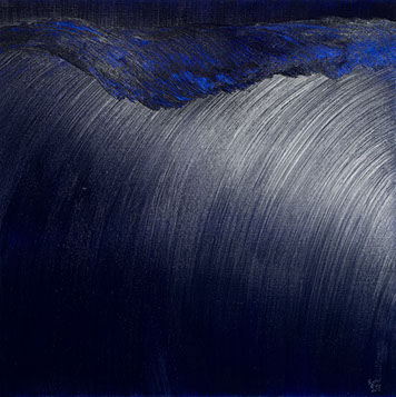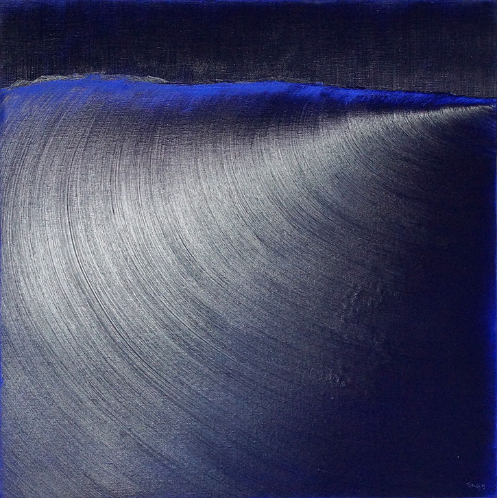 Le geste porté par l’énergie devient vague, il suit les ondes, surfe sur une crête ou un retour d’écume. Le pinceau creuse des sillons dans la pâte huileuse tandis qu’en surface, la lumière produit des miroitements infiniment changeants, renouvelant à chaque instant la vision du spectateur qui se déplace.