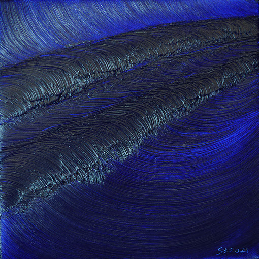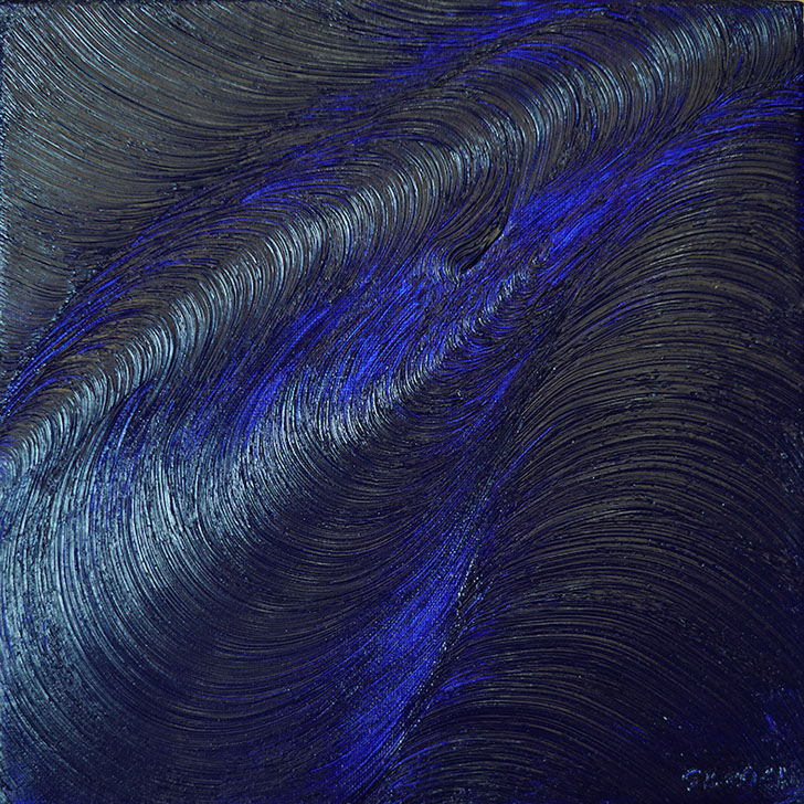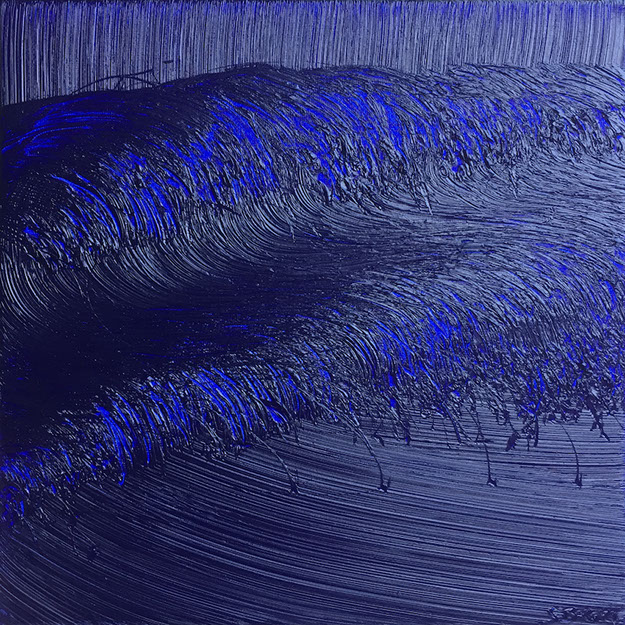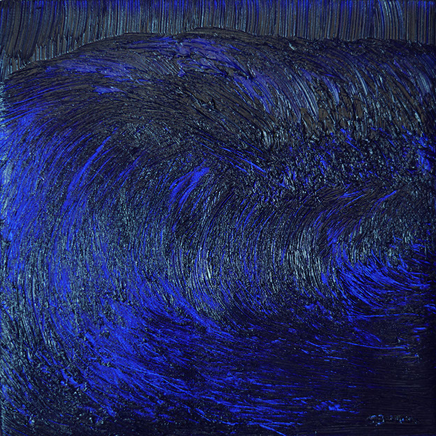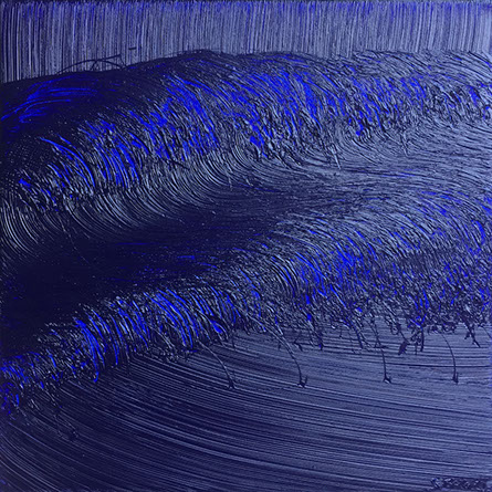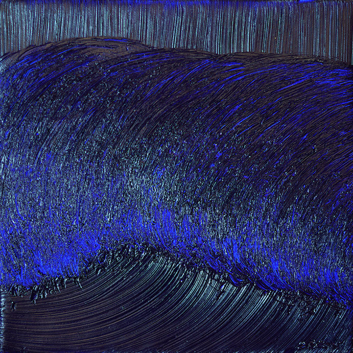 Le geste porté par l’énergie devient vague, il suit les ondes, surfe sur une crête ou un retour d’écume. Le pinceau creuse des sillons dans la pâte huileuse tandis qu’en surface, la lumière produit des miroitements infiniment changeants, renouvelant à chaque instant la vision du spectateur qui se déplace.