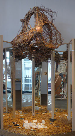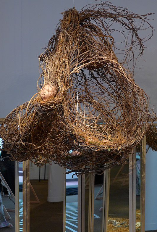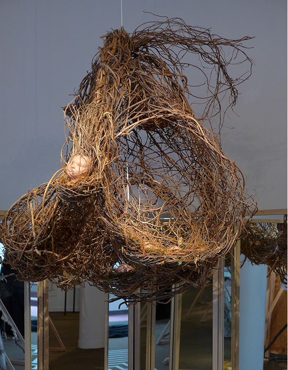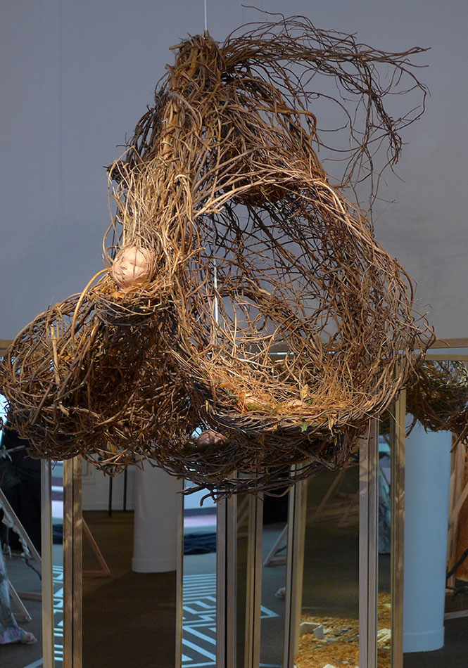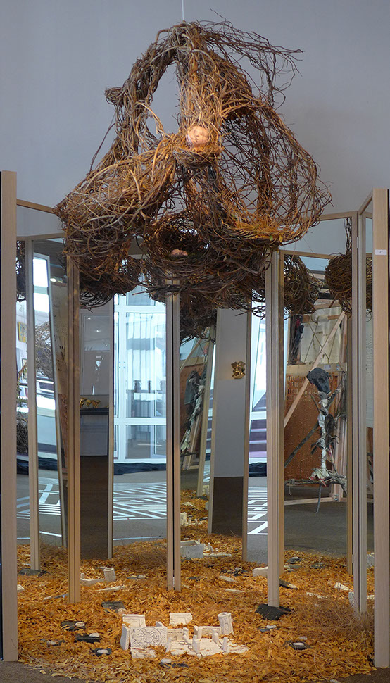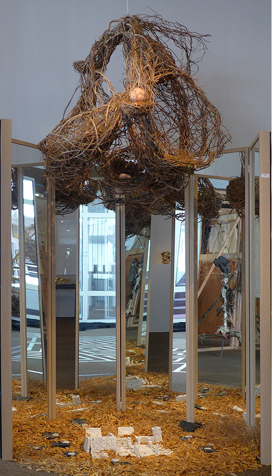 Lianes, argile, fleurs séchées, feuilles d’acacia, miroirs.