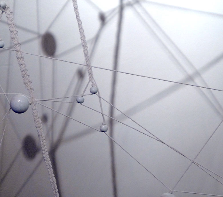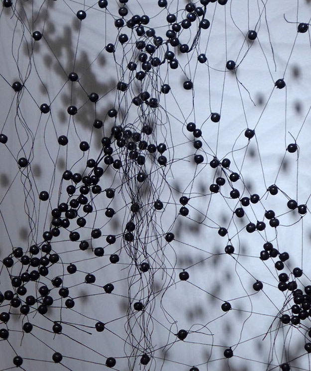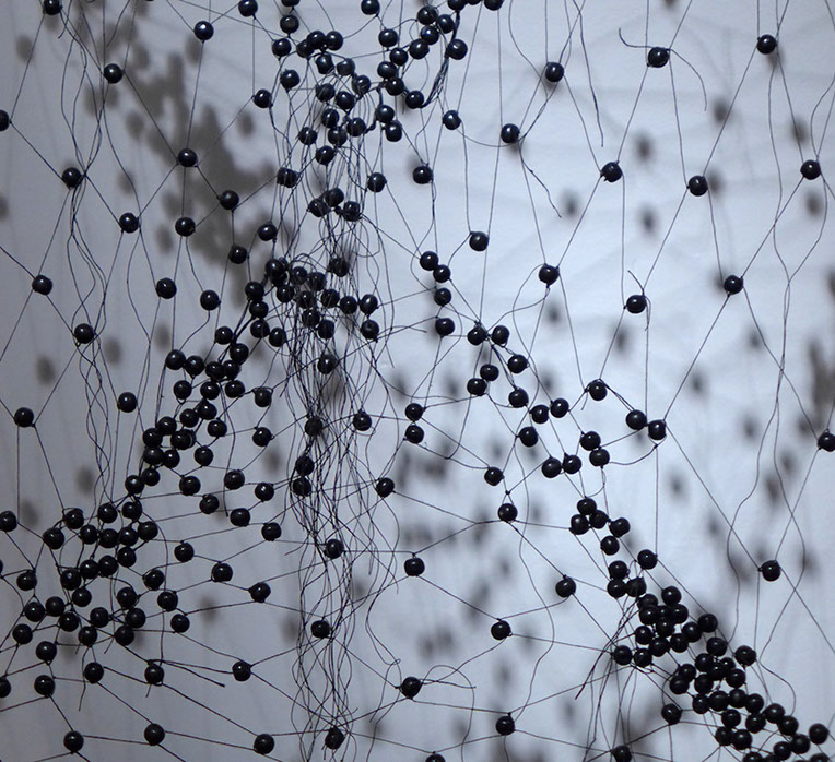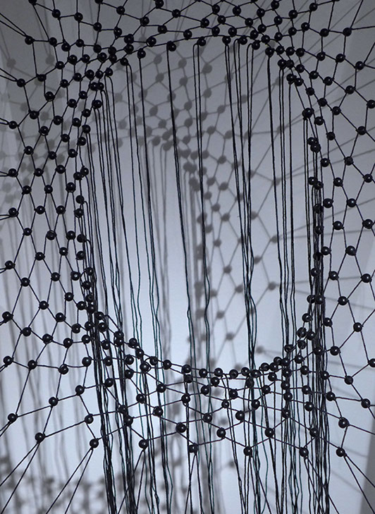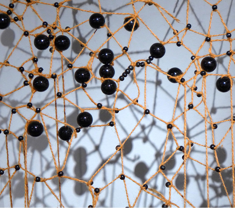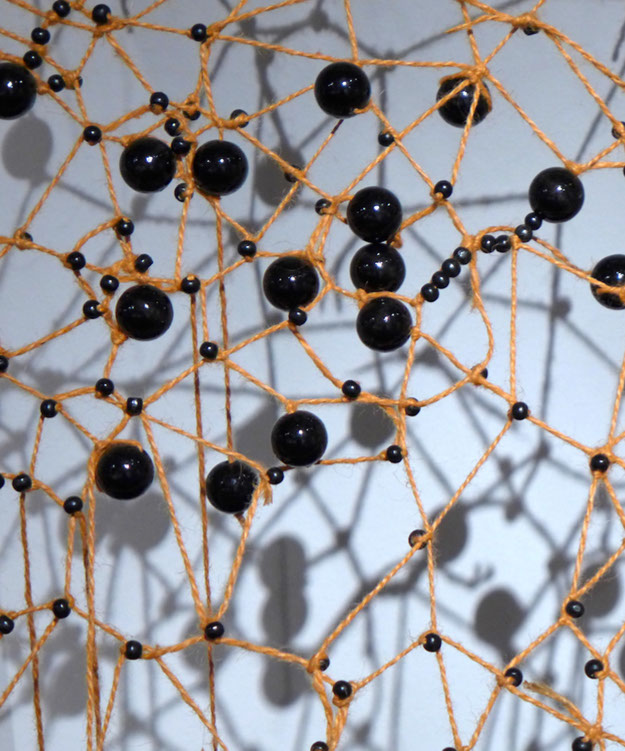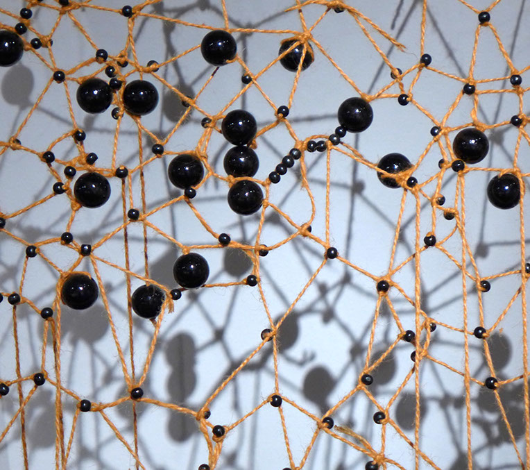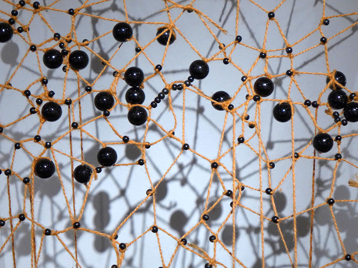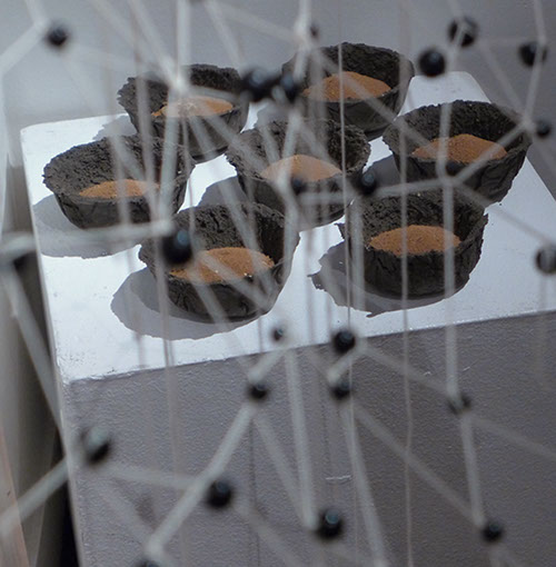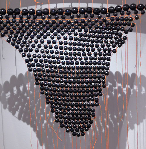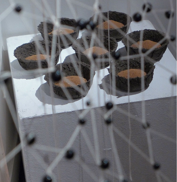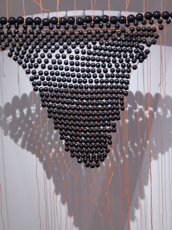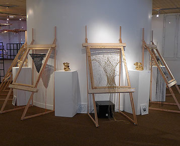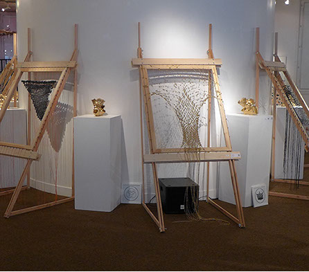 Le travail de la tisserande est représenté par sept métiers à tisser et sept tissages composés de fils et de perles de différentes matières et couleurs qui s’entremêlent comme autant de points et de lignes suggestives d’un univers féminin. À droite les sept coupelles remplies de terres rouges servant aux rituels de lavage des mains des tisserandes.